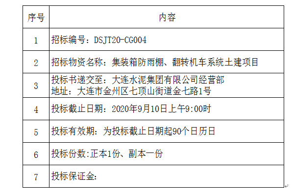 2.項(xiàng)目說(shuō)明:大連水泥集團(tuán)有限公司組織對(duì)大連水泥廠2#鋼倉(cāng)北側(cè)新建兩條水泥集裝箱系統(tǒng)防雨棚、2#鋼倉(cāng)北側(cè)水泥集裝箱翻轉(zhuǎn)機(jī)裝車(chē)系統(tǒng)土建、3#、4#庫(kù)側(cè)水泥集裝箱防雨棚項(xiàng)目項(xiàng)目進(jìn)行邀請(qǐng)招標(biāo)。凡接到本招標(biāo)邀請(qǐng)的廠商均可參加投標(biāo)。